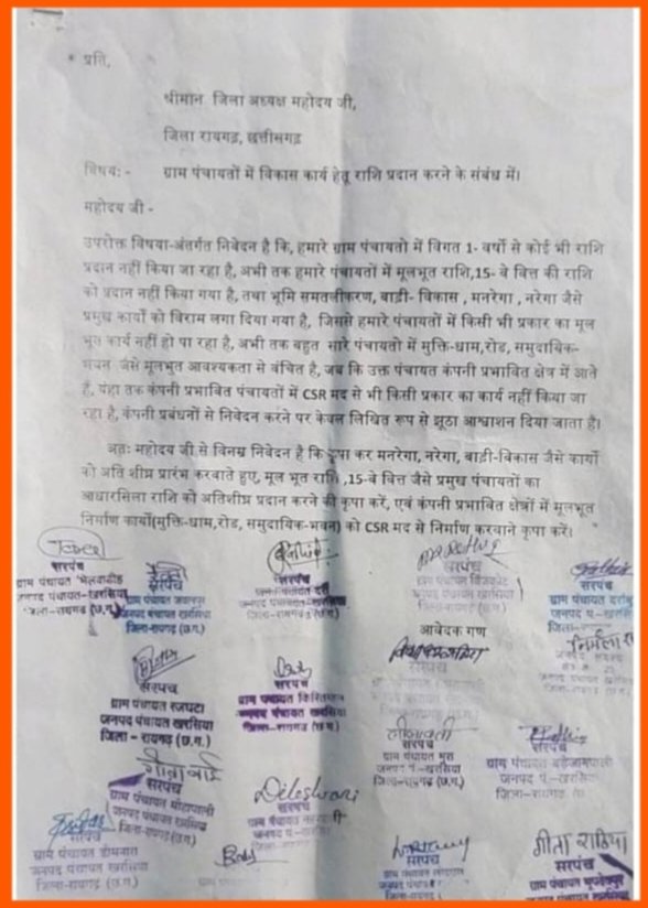 इसी गंभीर स्थिति को देखते हुए पुसौर क्षेत्र की दर्जनों ग्राम पंचायतों के सरपंचों और जनप्रतिनिधियों ने जिला कलेक्टर रायगढ़ को संयुक्त रूप से एक विस्तृत ज्ञापन सौंपकर तुरंत फंड जारी करने की मांग की है। ज्ञापन में स्पष्ट उल्लेख किया गया है कि— पंचायतों को वर्ष-1 वर्ग की राशि अब तक नहीं मिली। 15वें वित्त आयोग की मद भी विलंबित है। इसी कारण नरेगा, स्वच्छ भारत मिशन, पेयजल, मरम्मत, सीमेंट-कांक्रीट तथा अन्य निर्माण कार्यों की राशि एक साल से अटकी है। मूलभूत कार्यों जैसे—समुदाय भवन, सड़क, नाली, हैंडपंप मरम्मत, सीसी रोड आदि कार्य सब बंद हैं। पंचायतें कंपनियों से CSR मद में सहयोग की मांग करती रहीं, लेकिन कोई सहायता नहीं मिली।