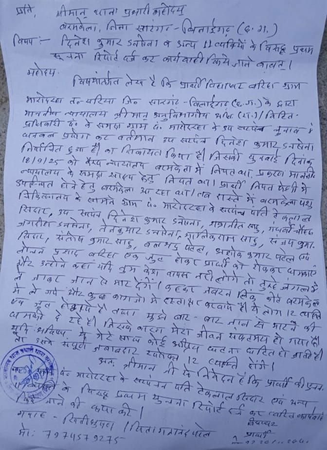 विद्याधर बरिहा और उनके सहयोगी खितीभूषण ने इस मामले की लिखित शिकायत थाना बरमकेला में दर्ज कराई है। इसमें सरपंच पति टेकलाल सिदार, उप सरपंच दिनेश डनसेना, शक्राजीत साहू, गंधर्वी चौहान, जगदीश डनसेना, तेजकुमार डनसेना, मालिकराम साहू, संजय सिदार, संतोष साहू, बलभद्र पटेल, अशोक पटेल, लोचन बरिहा समेत कुल 13 लोगों को नामजद रिपोर्ट किया गया है।
